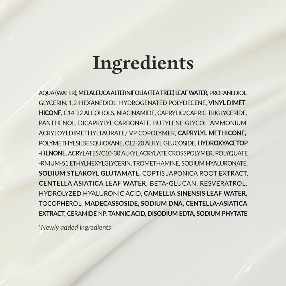 Ingrediente: Water(Aqua), Melaleuca Alternifolia (Tea Tree) Leaf Water, Propanediol, Glycerin, 1,2-Hexanediol, Hydrogenated Polydecene, Vinyl Dimethicone, C14-22 Alcohols, Caprylic/Capric Triglyceride, Niacinamide, Panthenol, Dicaprylyl Carbonate, Butylene Glycol, Ammonium Acryloyldimethyltaurate/VP Copolymer, Caprylyl Methicone, Polymethylsilses-quioxane, C12-20 Alkyl Glucoside, Hydroxyacetophenone, Acrylates/C10-30 Alkyl Acrylate Crosspolymer, Polyquaternium-51, Ethylhexylglycerin, Tromethamine, Sodium Hyaluronate, Sodium Stearoyl Glutamate, Coptis Japonica Root Extract, Centella Asiatica Leaf Water, Beta-Glucan, Resveratrol, Hydrolyzed Hyaluronic Acid, Camellia Sinensis Leaf Water, Tocopherol, Madecassoside, Sodium DNA, Centella Asiatica Extract, Ceramide NP, Tannic Acid, Disodium EDTA, Sodium Phytate