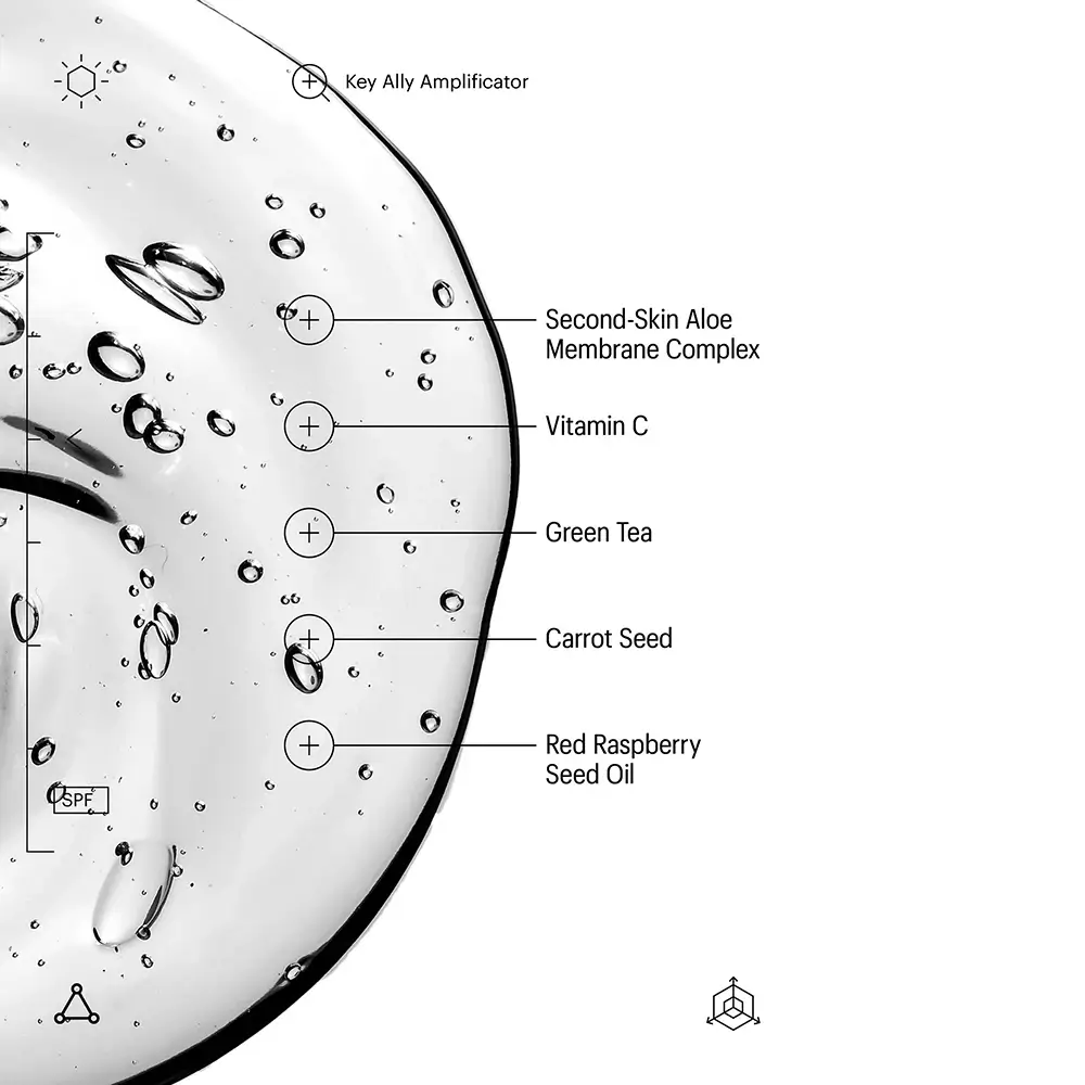 Ingrediente: Isododecane, Dimethicone/Bis-Isobutyl PPG-20 Crosspolymer, Octocrylene, Homosalate, Ethylhexyl Salicylate, Butyloctyl Salicylate, Caprylic/Capric Triglyceride, Tridecyl Salicylate, Butyl Methoxydibenzoylmethane, Aloe Barbadensis Leaf Extract (Aloe Vera), Camellia Sinensis Leaf Extract (Green Tea), Citrullus Lanatus Fruit Extract (Watermelon), Daucus Carota Sativa Root Extract (Carrot), Tetrahexyldecyl Ascorbate (Vitamin C), Glycyrrhiza Glabra Root Extract (Licorice), Punica Granatum Fruit Extract (Pomegranate), Rubus Idaeus Seed Oil (Raspberry), Niacinamide, Tocopherol (Vitamin E), Helianthus Annuus Seed Oil (Sunflower), Rosmarinus Officinalis Leaf Extract (Rosemary).